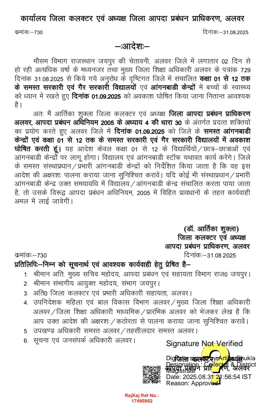 अलवर.। कलक्टर एवं जिला आपदा प्रबंधन प्राधिकरण की अध्यक्ष डॉ. आर्तिका शुक्ला ने मौसम विभाग द्वारा जारी जिले में अति वर्षा की चेतावनी एवं पूर्वानुमान को मध्यनजर रखते हुए आदेश जारी कर जिले के समस्त आंगनबाडी केंद्रों एवं कक्षा 1 से 12 तक के समस्त राजकीय एवं गैर राजकीय विद्यालयों में आपदा प्रबंधन अधिनियम 2005 के अंतर्गत प्रदत्त शक्ति का प्रयोग करते हुए 1 सितंबर को अवकाश घोषित किया है।