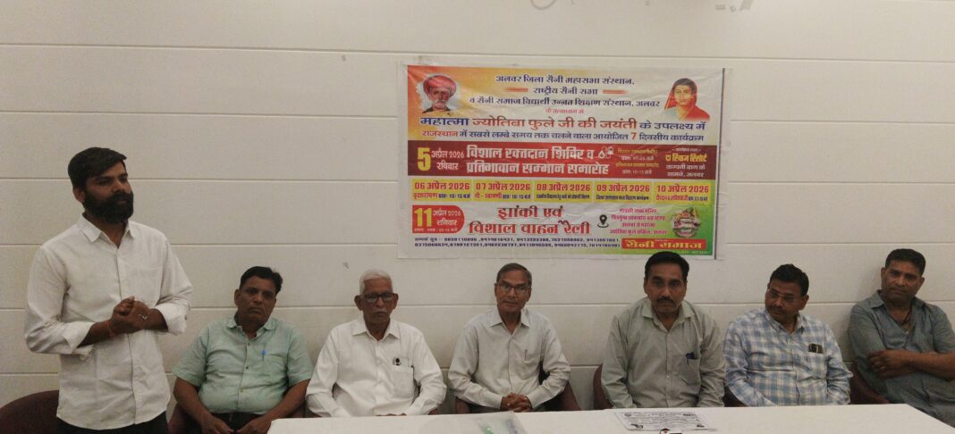 महात्मा ज्योतिबा फुले की जयंती के पावन अवसर पर अलवर जिला सैनी महासभा संस्थान, राष्ट्रीय सैनी सभा और सैनी समाज विद्यार्थी उन्नत शिक्षण संस्थान के संयुक्त तत्वावधान में 7 दिवसीय कार्यक्रम होंगे। इस संबंध में आज आयोजित एक प्रेस वार्ता के दौरान समाज के पदाधिकारियों ने कार्यक्रम की जानकारी दी।