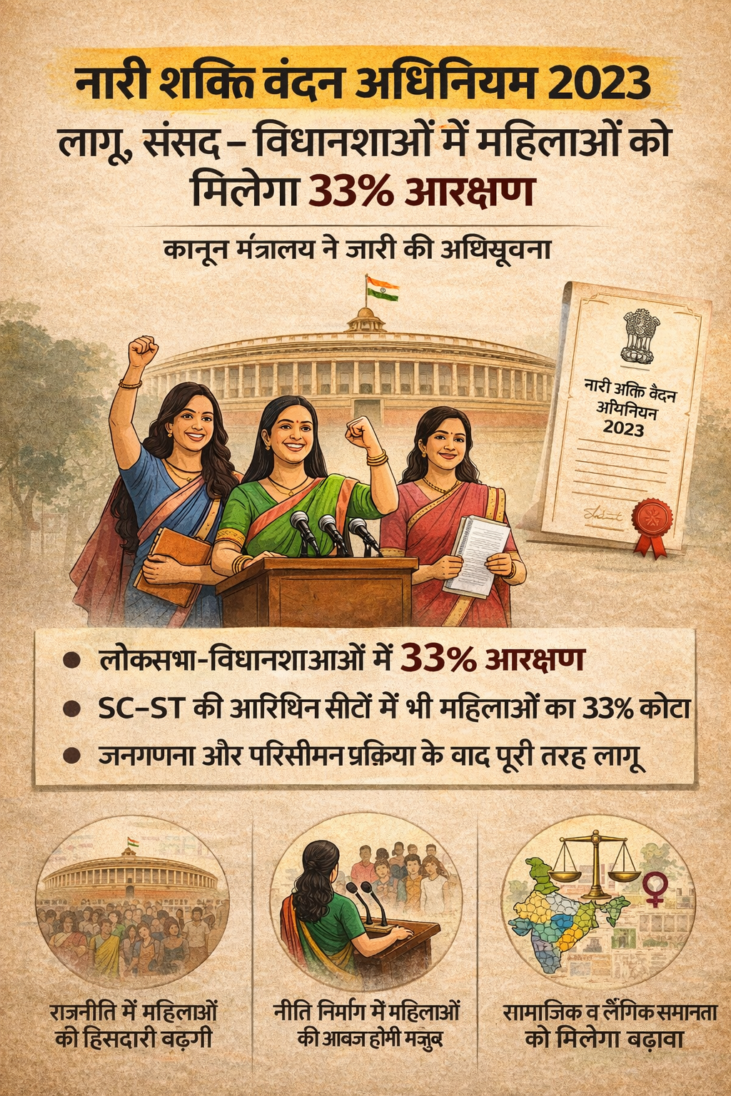 नारी शक्ति वंदन अधिनियम 2023 लागू, संसद-विधानसभाओं में महिलाओं को मिलेगा 33% आरक्षण